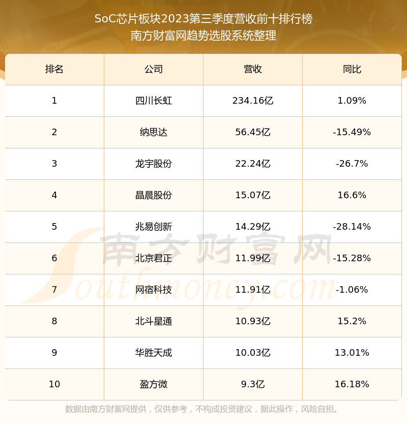 按照南方财富网趋势选股系统统计,该股所属板块为SoC芯片板块,该板块共有35只股票,炬芯科技2023第三季度营收在该板块中排名为第30名,该板块2023第三季度营收排名前十的股票如下表: