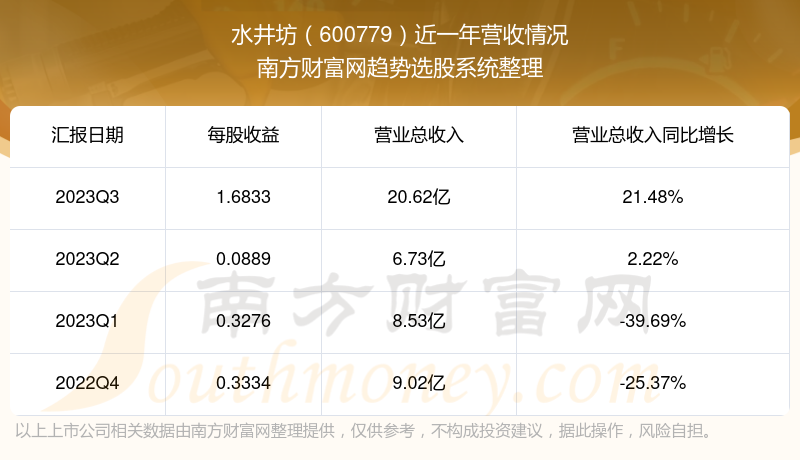 按照南方财富网趋势选股系统统计,该股所属板块为白酒板块,该板块共有62只股票,水井坊2023第三季度营收在该板块中排名为第20名,该板块2023第三季度营收排名前十的股票如下表: