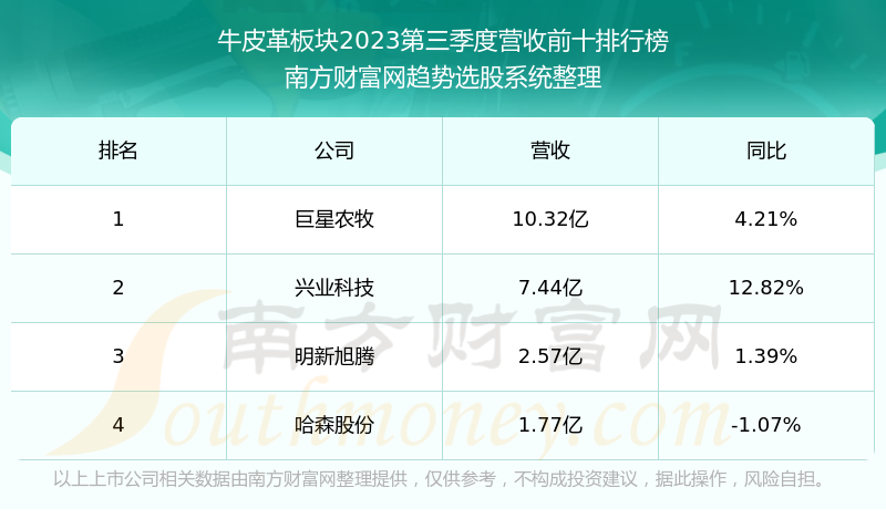 按照南方财富网趋势选股系统统计,该股所属板块为牛皮革板块,该板块共有4只股票,明新旭腾2023第三季度营收在该板块中排名为第3名,该板块2023第三季度营收排名前十的股票如下表: