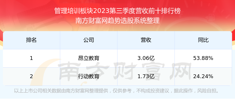 按照南方财富网趋势选股系统统计,该股所属板块为管理培训板块,该板块共有2只股票,行动教育2023第三季度营收在该板块中排名为第2名,该板块2023第三季度营收排名前十的股票如下表: