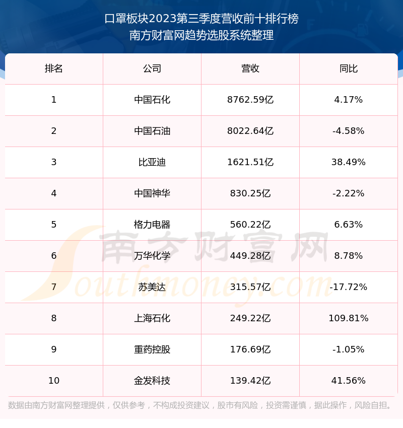 按照南方财富网趋势选股系统统计,该股所属板块为口罩板块,该板块共有220只股票,珍宝岛2023第三季度营收在该板块中排名为第94名,该板块2023第三季度营收排名前十的股票如下表: