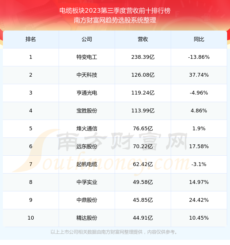 按照南方财富网趋势选股系统统计,该股所属板块为电缆板块,该板块共有37只股票,永鼎股份2023第三季度营收在该板块中排名为第21名,该板块2023第三季度营收排名前十的股票如下表:
