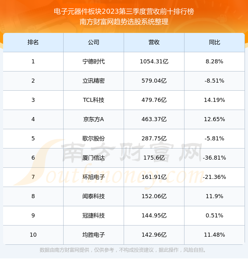 按照南方财富网趋势选股系统统计,该股所属板块为电子元器件板块,该板块共有160只股票,泰晶科技2023第三季度营收在该板块中排名为第127名,该板块2023第三季度营收排名前十的股票如下表: