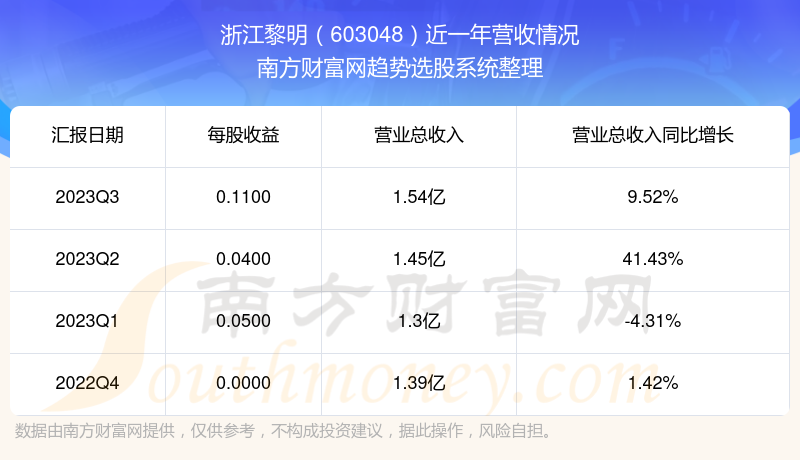 浙江黎明股票近一年营收情况如下表: