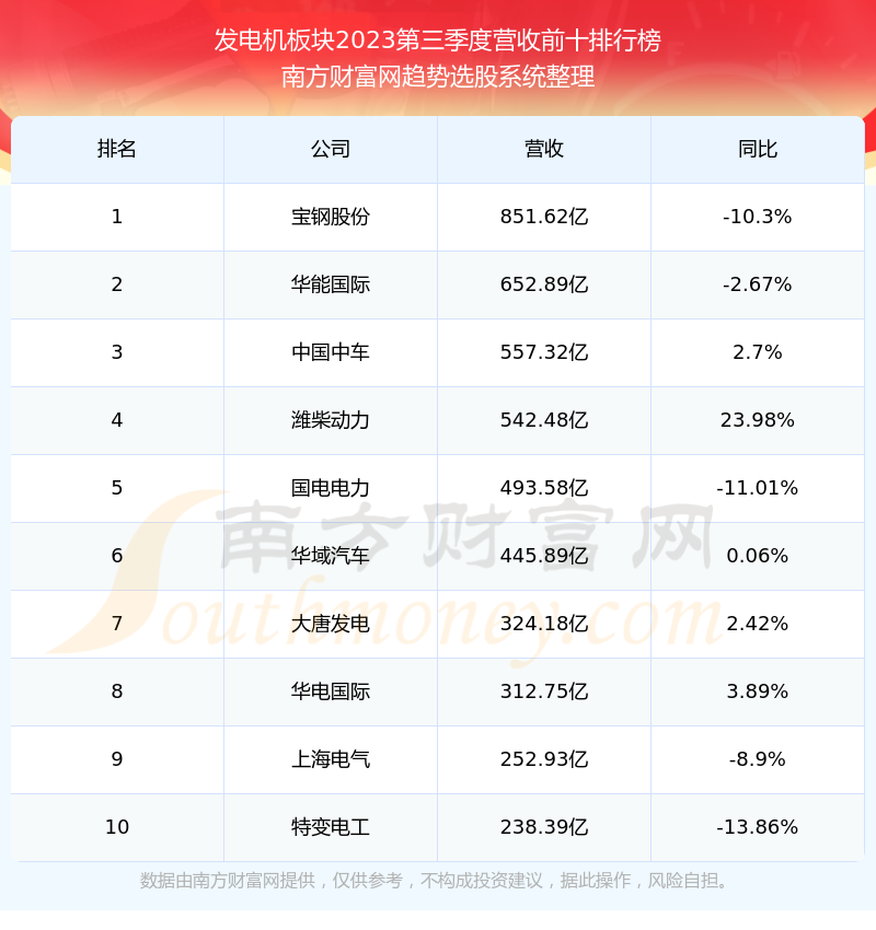 按照南方财富网趋势选股系统统计,该股所属板块为发电机板块,该板块共有151只股票,德宏股份2023第三季度营收在该板块中排名为第142名,该板块2023第三季度营收排名前十的股票如下表: