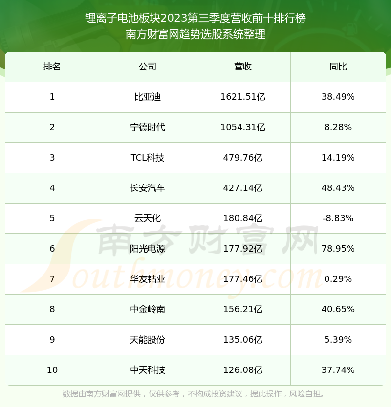 按照南方财富网趋势选股系统统计,该股所属板块为锂离子电池板块,该板块共有141只股票,博力威2023第三季度营收在该板块中排名为第106名,该板块2023第三季度营收排名前十的股票如下表: