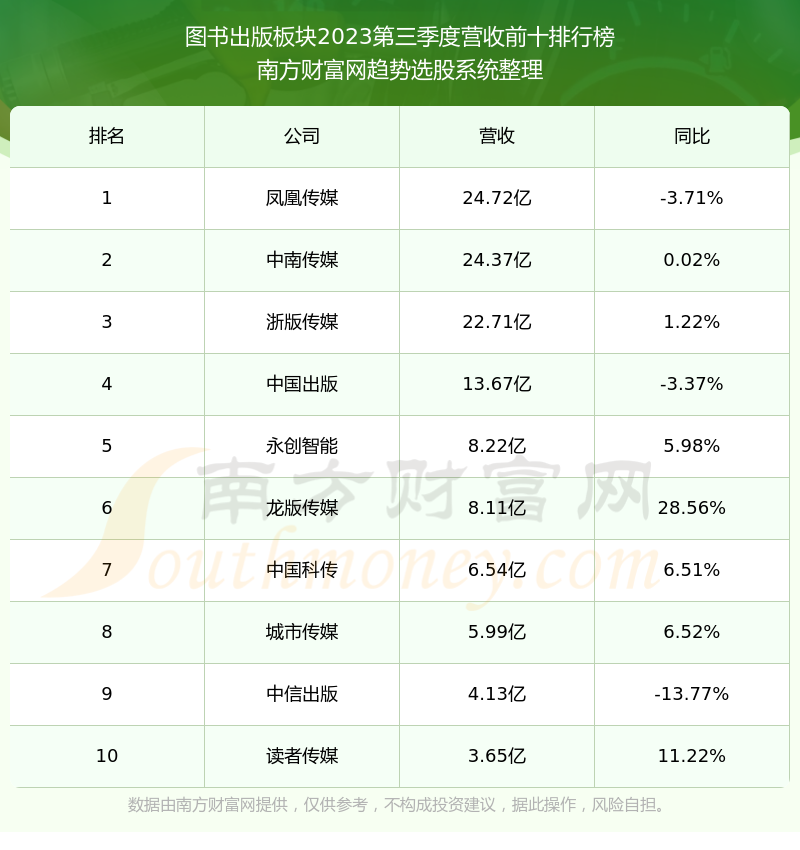按照南方财富网趋势选股系统统计,该股所属板块为图书出版板块,该板块共有13只股票,新华文轩2023第三季度营收在该板块中排名为第13名,该板块2023第三季度营收排名前十的股票如下表: