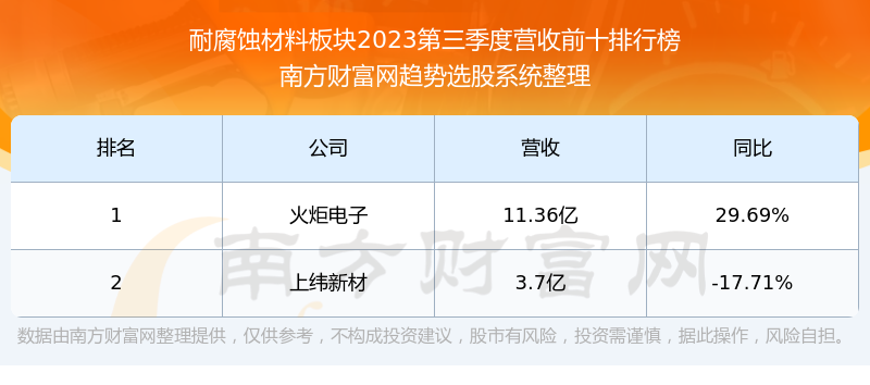按照南方财富网趋势选股系统统计,该股所属板块为耐腐蚀材料板块,该板块共有2只股票,上纬新材2023第三季度营收在该板块中排名为第2名,该板块2023第三季度营收排名前十的股票如下表: