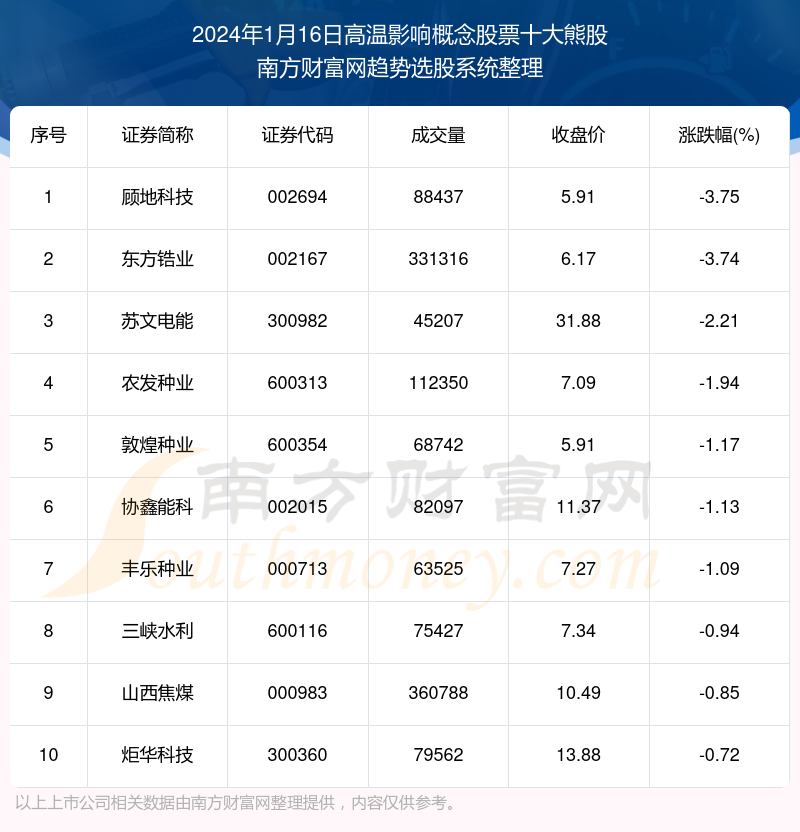 截止2024年1月16日,个股表现方面,高温影响概念股票当日领跌股为顾地科技(002694),该股当日报收5.91,上涨-3.75%,成交量8.84万。东方锆业(002167)以下跌-3.74%紧随其后,该股当日成交量33.13万。此外,苏文电能(300982)、农发种业(600313)、敦煌种业(600354)均进入当日高温影响概念股票熊股之列。