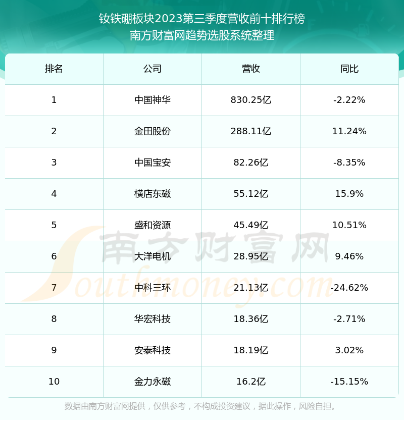 按照南方财富网趋势选股系统统计,该股所属板块为钕铁硼板块,该板块共有22只股票,宁波韵升2023第三季度营收在该板块中排名为第12名,该板块2023第三季度营收排名前十的股票如下表: