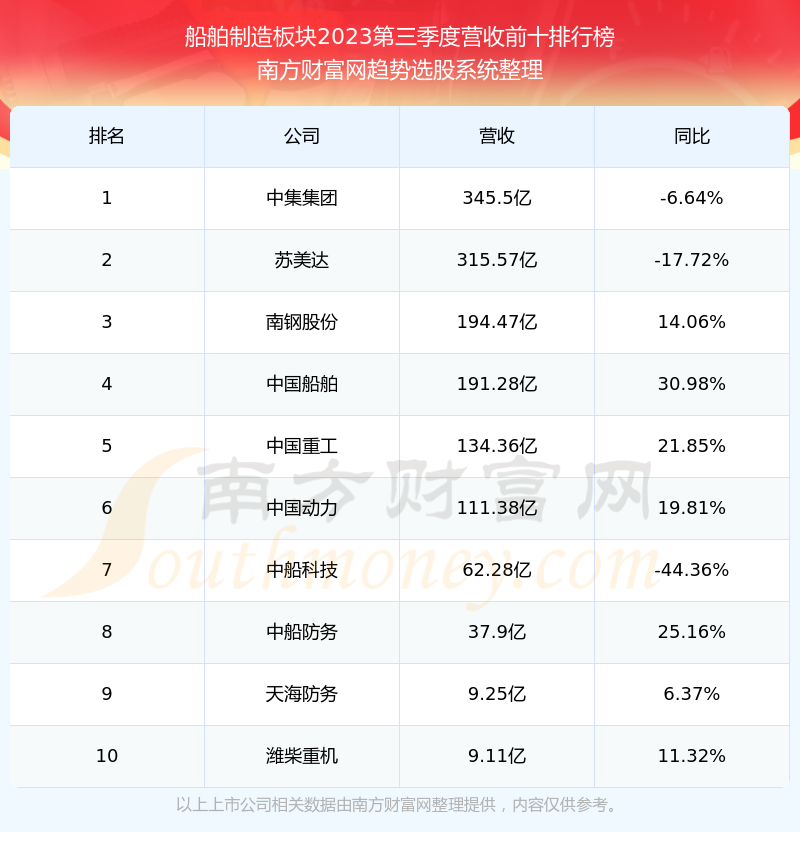 按照南方财富网趋势选股系统统计,该股所属板块为船舶制造板块,该板块共有18只股票,中国动力2023第三季度营收在该板块中排名为第6名,该板块2023第三季度营收排名前十的股票如下表: