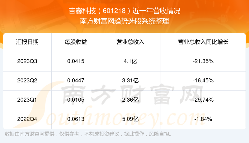 吉鑫科技2023年第三季度财报显示,公司主营收入4.1亿元,同比-21.35%;归母净利润4019.09万元,同比81.22%。
