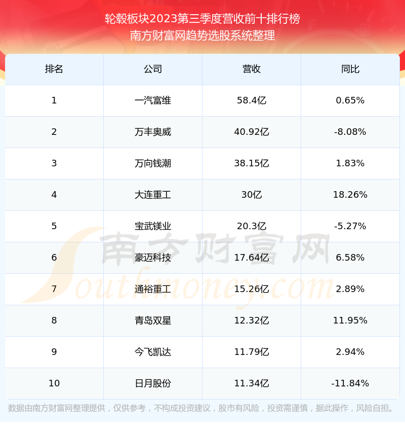 按照南方财富网趋势选股系统统计,该股所属板块为轮毂板块,该板块共有24只股票,吉鑫科技2023第三季度营收在该板块中排名为第20名,该板块2023第三季度营收排名前十的股票如下表: