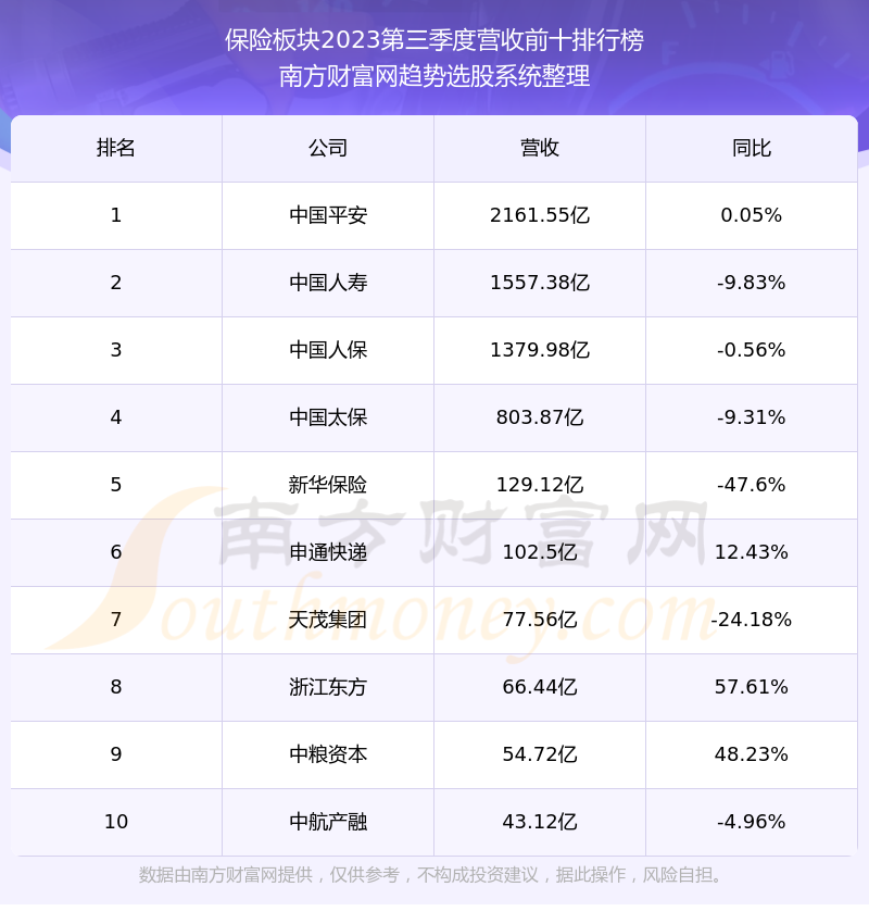按照南方财富网趋势选股系统统计,该股所属板块为保险板块,该板块共有16只股票,中国人寿2023第三季度营收在该板块中排名为第2名,该板块2023第三季度营收排名前十的股票如下表:
