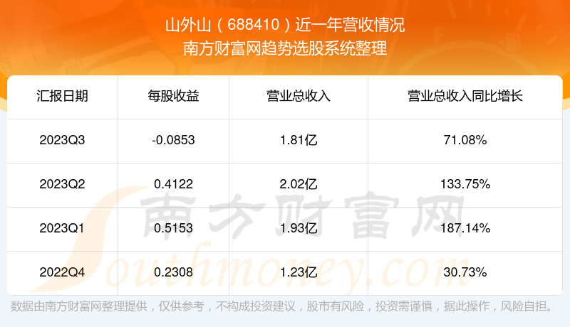 山外山2023年第三季度公司实现营业收入1.81亿元,同比71.08%;归母净利润4737.75万元,同比176.45%。