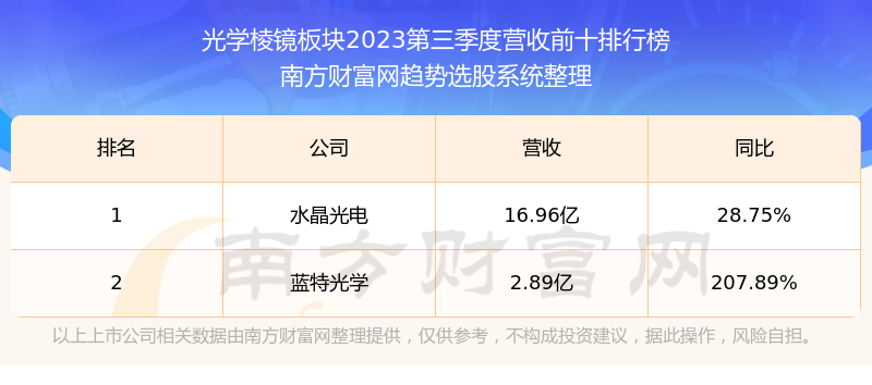 按照南方财富网趋势选股系统统计,该股所属板块为光学棱镜板块,该板块共有2只股票,蓝特光学2023第三季度营收在该板块中排名为第2名,该板块2023第三季度营收排名前十的股票如下表: