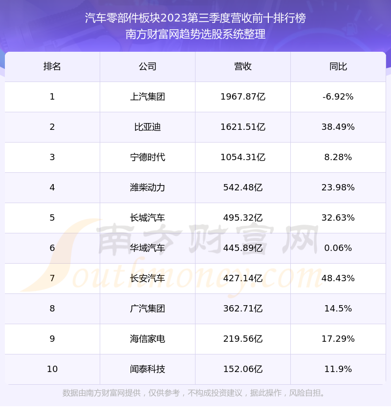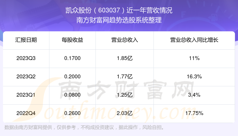 按照南方财富网趋势选股系统统计,该股所属板块为汽车零部件板块,该板块共有468只股票,凯众股份2023第三季度营收在该板块中排名为第389名,该板块2023第三季度营收排名前十的股票如下表: