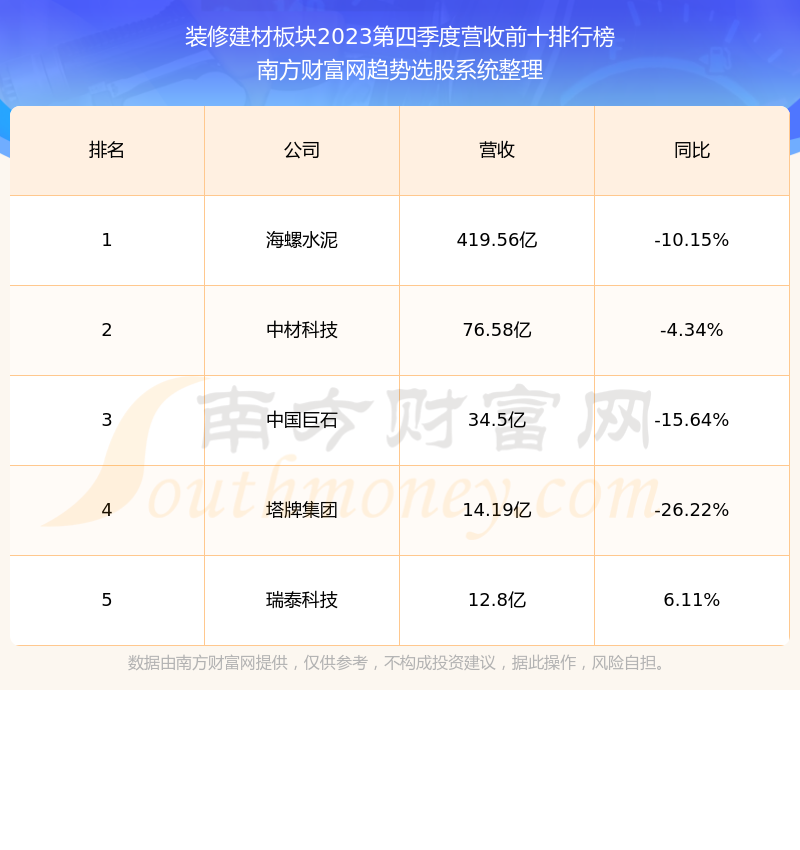 按照南方财富网趋势选股系统统计,该股所属板块为装修建材板块,该板块共有5只股票,我乐家居2023第四季度营收在该板块中排名为第5名,该板块2023第四季度营收排名前十的股票如下表: