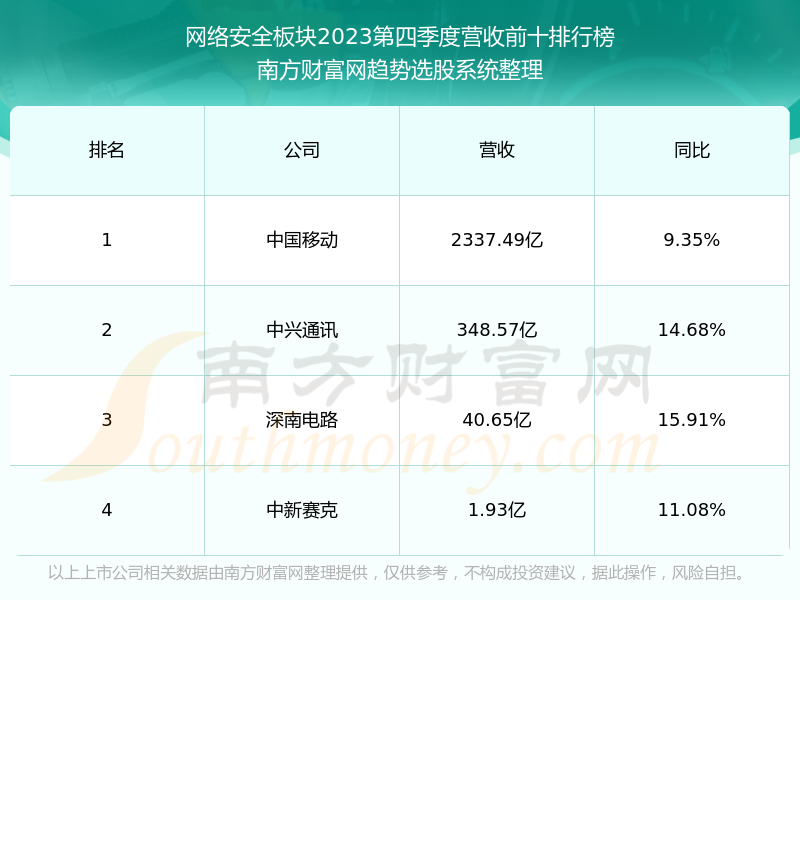 按照南方财富网趋势选股系统统计,该股所属板块为网络安全板块,该板块共有4只股票,盛邦安全2023第四季度营收在该板块中排名为第4名,该板块2023第四季度营收排名前十的股票如下表: