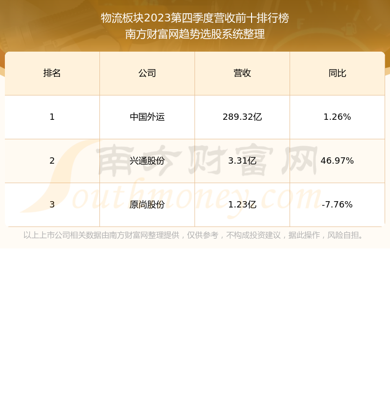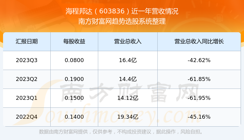 按照南方财富网趋势选股系统统计,该股所属板块为物流板块,该板块共有3只股票,海程邦达2023第四季度营收在该板块中排名为第3名,该板块2023第四季度营收排名前十的股票如下表: