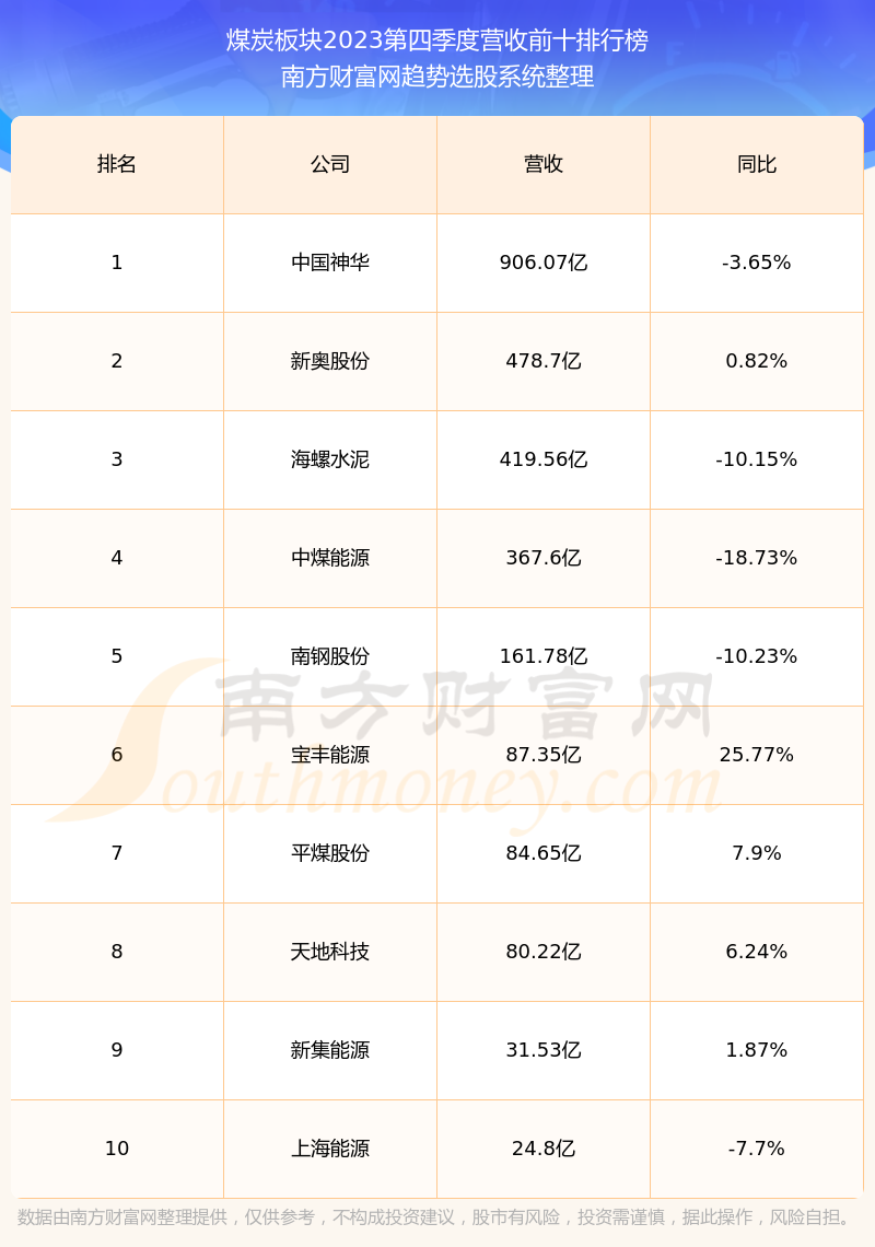 按照南方财富网趋势选股系统统计,该股所属板块为煤炭板块,该板块共有11只股票,中煤能源2023第四季度营收在该板块中排名为第4名,该板块2023第四季度营收排名前十的股票如下表: