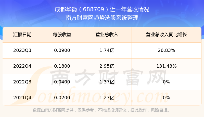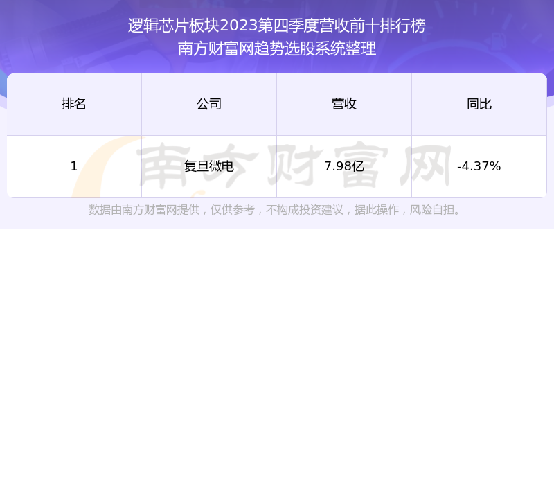 按照南方财富网趋势选股系统统计,该股所属板块为逻辑芯片板块,该板块共有1只股票,成都华微2023第四季度营收在该板块中排名为第1名,该板块2023第四季度营收排名前十的股票如下表: