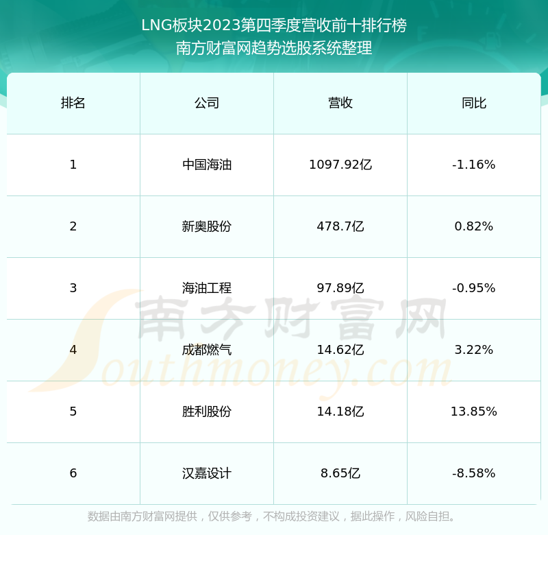 按照南方财富网趋势选股系统统计,该股所属板块为LNG板块,该板块共有6只股票,洪通燃气2023第四季度营收在该板块中排名为第6名,该板块2023第四季度营收排名前十的股票如下表: