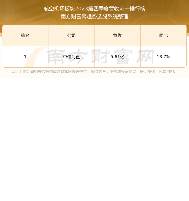 按照南方财富网趋势选股系统统计,该股所属板块为航空机场板块,该板块共有1只股票,吉祥航空2023第四季度营收在该板块中排名为第1名,该板块2023第四季度营收排名前十的股票如下表: