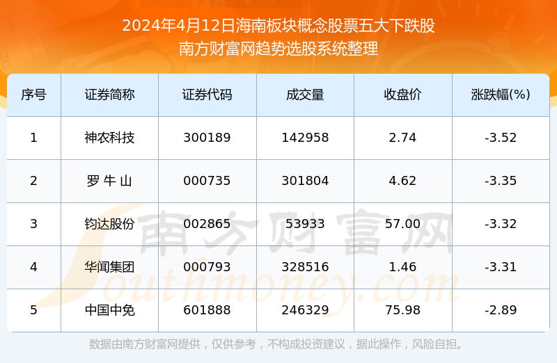 以上内容就是对【股票配资浙嘉配资 数据解盘|2024年4月12日海南板块概念股票五大熊股名单】的解答,如果解决了您的问题欢迎把链接分享给朋友(https://www.youge168.com/mod_article-article_content-article_id-54613.html)