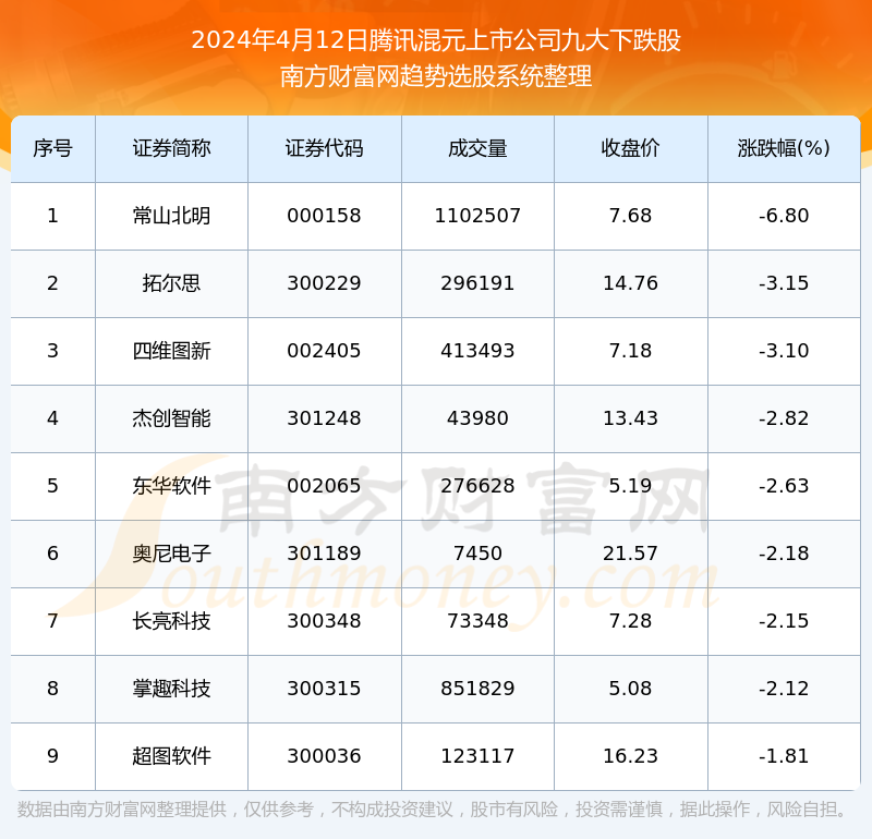 截止2024年4月12日,个股表现方面,腾讯混元上市公司当日领跌股为常山北明(000158),该股当日报收7.68,上涨-6.80%,成交量110.25万。拓尔思(300229)以下跌-3.15%紧随其后,该股当日成交量29.62万。此外,四维图新(002405)、杰创智能(301248)、东华软件(002065)均进入当日腾讯混元上市公司下跌股之列。