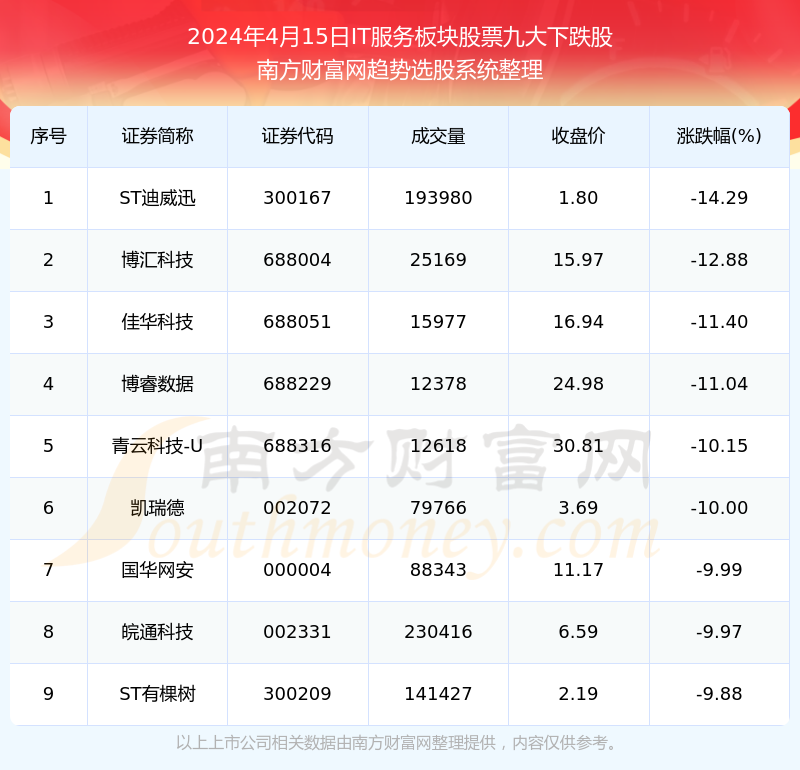 截止2024年4月15日,个股表现方面,IT服务板块股票当日领跌股为ST迪威迅(300167),该股当日报收1.80,上涨-14.29%,成交量19.4万。博汇科技(688004)以下跌-12.88%紧随其后,该股当日成交量2.52万。此外,佳华科技(688051)、博睿数据(688229)、青云科技-U(688316)均进入当日IT服务板块股票下跌股之列。
