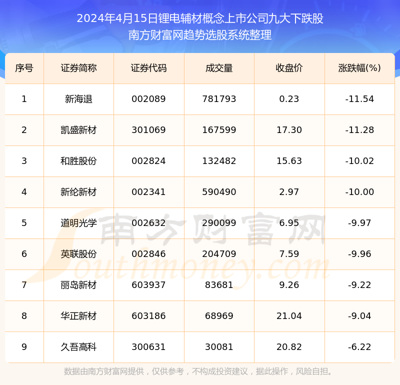 截止2024年4月15日,个股表现方面,锂电辅材概念上市公司当日领跌股为新海退(002089),该股当日报收0.23,上涨-11.54%,成交量78.18万。凯盛新材(301069)以下跌-11.28%紧随其后,该股当日成交量16.76万。此外,和胜股份(002824)、新纶新材(002341)、道明光学(002632)均进入当日锂电辅材概念上市公司下跌股之列。