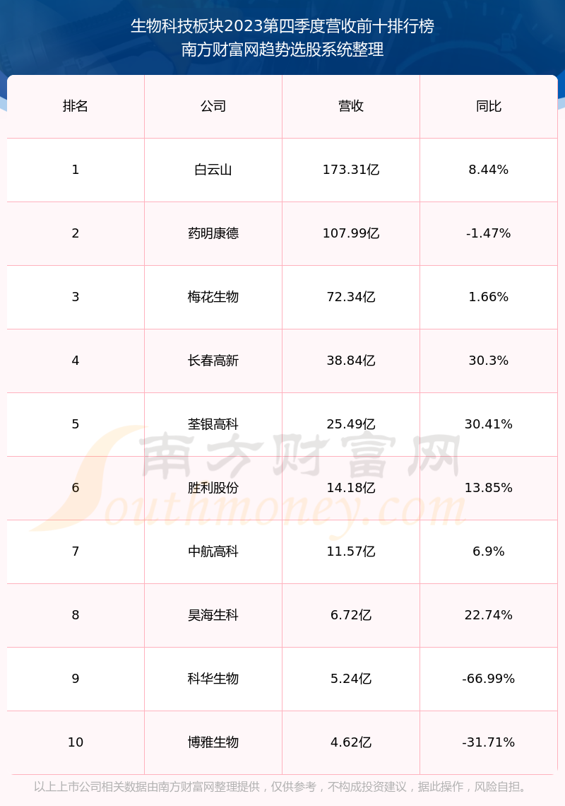 按照南方财富网趋势选股系统统计,该股所属板块为生物科技板块,该板块共有12只股票,奥浦迈2023第四季度营收在该板块中排名为第12名,该板块2023第四季度营收排名前十的股票如下表: