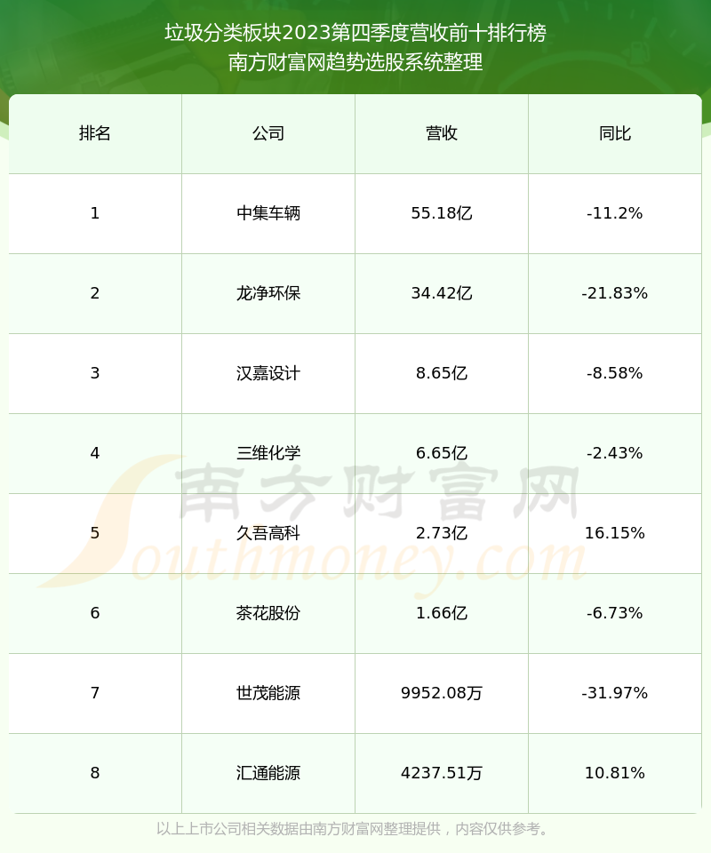 按照南方财富网趋势选股系统统计,该股所属板块为垃圾分类板块,该板块共有8只股票,中再资环2023第四季度营收在该板块中排名为第8名,该板块2023第四季度营收排名前十的股票如下表: