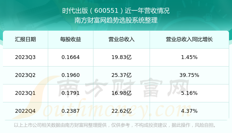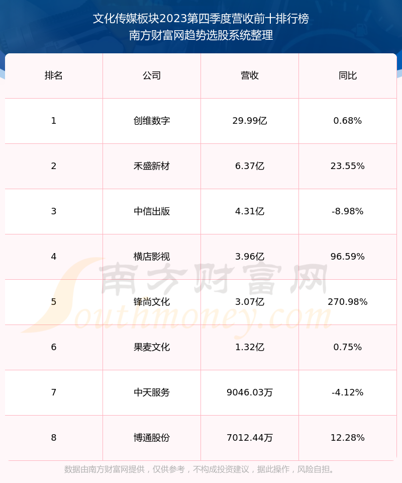 按照南方财富网趋势选股系统统计,该股所属板块为文化传媒板块,该板块共有8只股票,时代出版2023第四季度营收在该板块中排名为第8名,该板块2023第四季度营收排名前十的股票如下表: