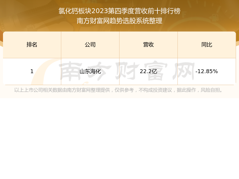 按照南方财富网趋势选股系统统计,该股所属板块为氯化钙板块,该板块共有1只股票,苏盐井神2023第四季度营收在该板块中排名为第1名,该板块2023第四季度营收排名前十的股票如下表: