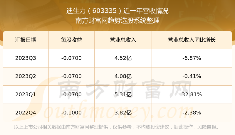 迪生力(603335)披露2023年第三季度报告,报告期实现营收4.52亿元,同比-6.87%;归母净利润-2993.4万元,同比-339.59%;扣非净利润-3013.55万元,同比-386.46%。
