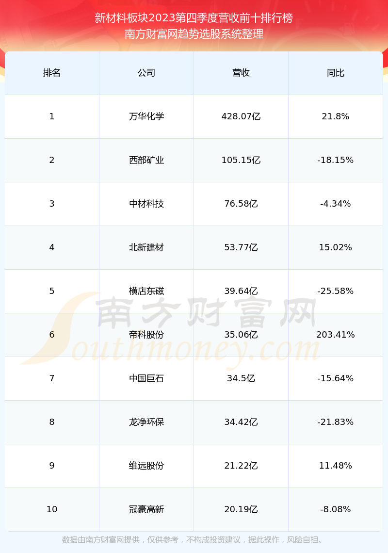 按照南方财富网趋势选股系统统计,该股所属板块为新材料板块,该板块共有41只股票,迪生力2023第四季度营收在该板块中排名为第41名,该板块2023第四季度营收排名前十的股票如下表: