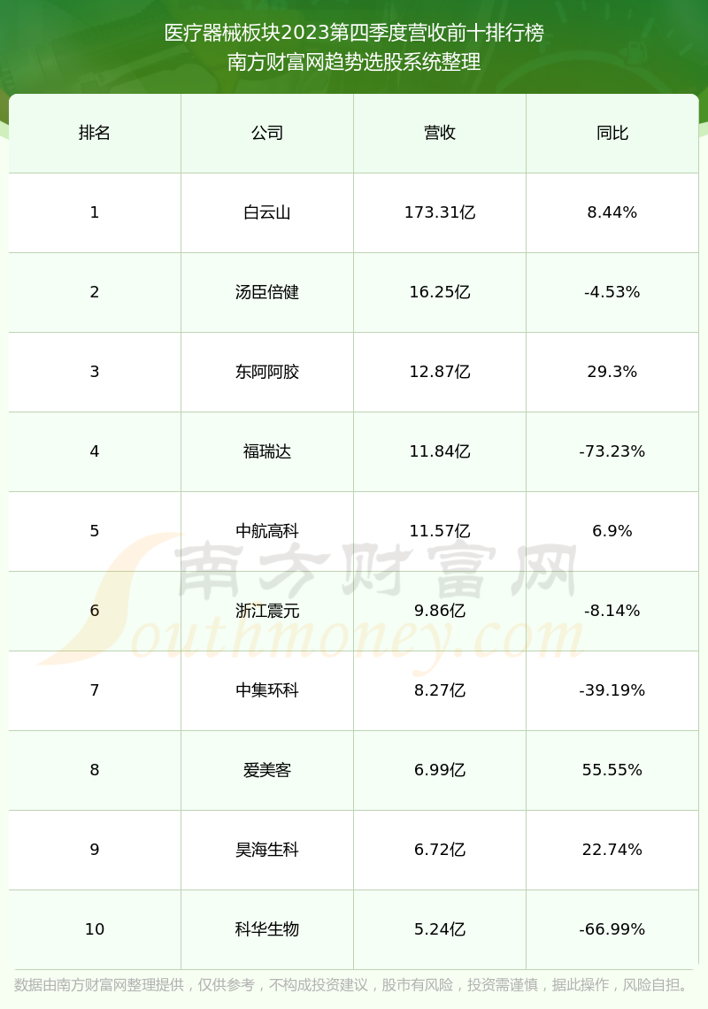 按照南方财富网趋势选股系统统计,该股所属板块为医疗器械板块,该板块共有20只股票,康德莱2023第四季度营收在该板块中排名为第20名,该板块2023第四季度营收排名前十的股票如下表: