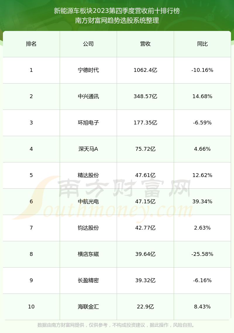 按照南方财富网趋势选股系统统计,该股所属板块为新能源车板块,该板块共有30只股票,赛力斯2023第四季度营收在该板块中排名为第30名,该板块2023第四季度营收排名前十的股票如下表: