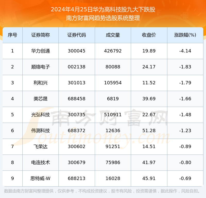 截止2024年4月25日,个股表现方面,华为高科技股当日领跌股为华力创通(300045),该股当日报收19.89,上涨-4.14%,成交量42.68万。顺络电子(002138)以下跌-1.83%紧随其后,该股当日成交量8.01万。此外,利和兴(301013)、美芯晟(688458)、光弘科技(300735)均进入当日华为高科技股下跌股之列。