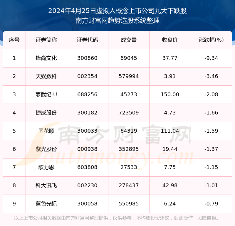 截止2024年4月25日,个股表现方面,虚拟人概念上市公司当日领跌股为锋尚文化(300860),该股当日报收37.77,上涨-9.34%,成交量6.9万。天娱数科(002354)以下跌-3.46%紧随其后,该股当日成交量58万。此外,寒武纪-U(688256)、捷成股份(300182)、同花顺(300033)均进入当日虚拟人概念上市公司下跌股之列。