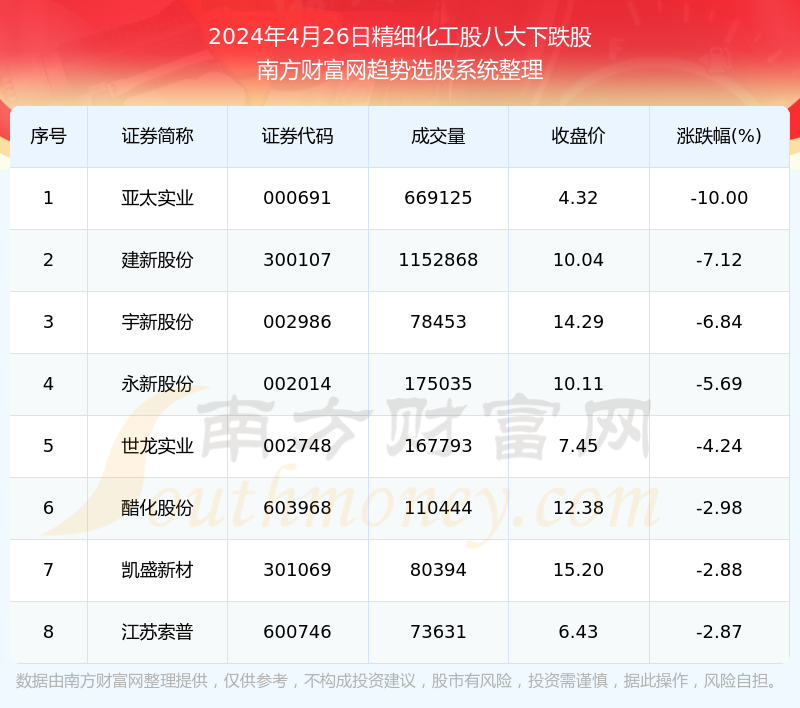 截止2024年4月26日,个股表现方面,精细化工股当日领跌股为亚太实业(000691),该股当日报收4.32,上涨-10.00%,成交量66.91万。建新股份(300107)以下跌-7.12%紧随其后,该股当日成交量115.29万。此外,宇新股份(002986)、永新股份(002014)、世龙实业(002748)均进入当日精细化工股下跌股之列。