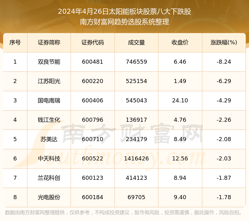 截止2024年4月26日,个股表现方面,太阳能板块股票当日领跌股为双良节能(600481),该股当日报收6.46,上涨-8.24%,成交量74.66万。江苏阳光(600220)以下跌-6.29%紧随其后,该股当日成交量52.52万。此外,国电南瑞(600406)、钱江生化(600796)、苏美达(600710)均进入当日太阳能板块股票下跌股之列。