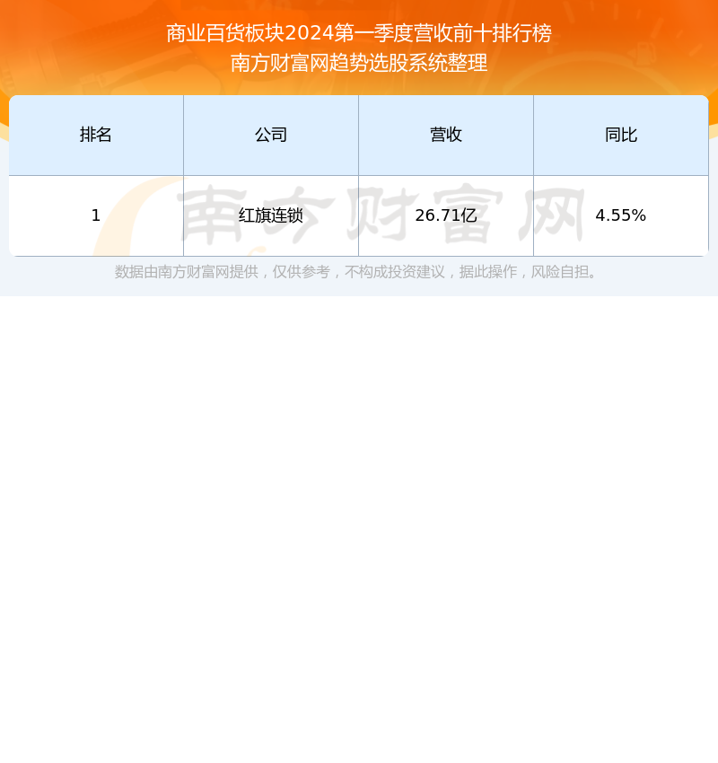 按照南方财富网趋势选股系统统计,该股所属板块为商业百货板块,该板块共有1只股票,上海九百2024第一季度营收在该板块中排名为第1名,该板块2024第一季度营收排名前十的股票如下表: