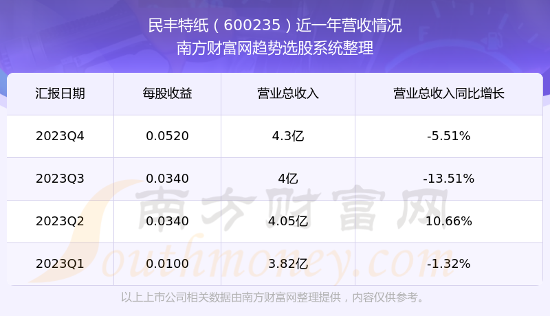 民丰特纸发布2023年第四季度财报。实现总营收4.3亿元,同比增长-5.51%;扣非净利润同比增长2996.48%至1949.85万元。