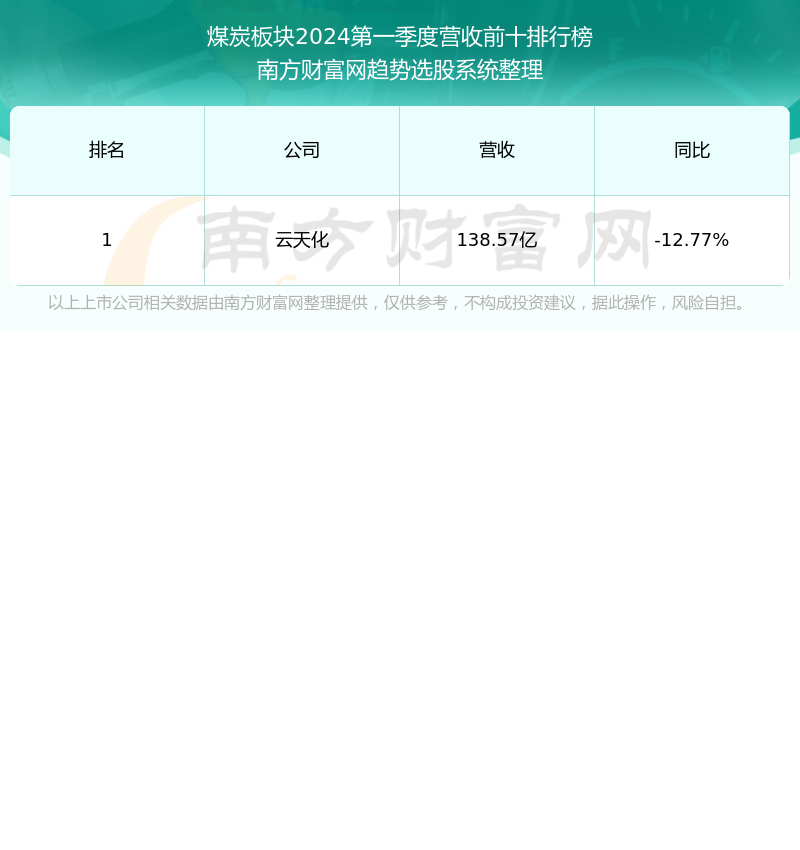 按照南方财富网趋势选股系统统计,该股所属板块为煤炭板块,该板块共有1只股票,昊华能源2024第一季度营收在该板块中排名为第1名,该板块2024第一季度营收排名前十的股票如下表: