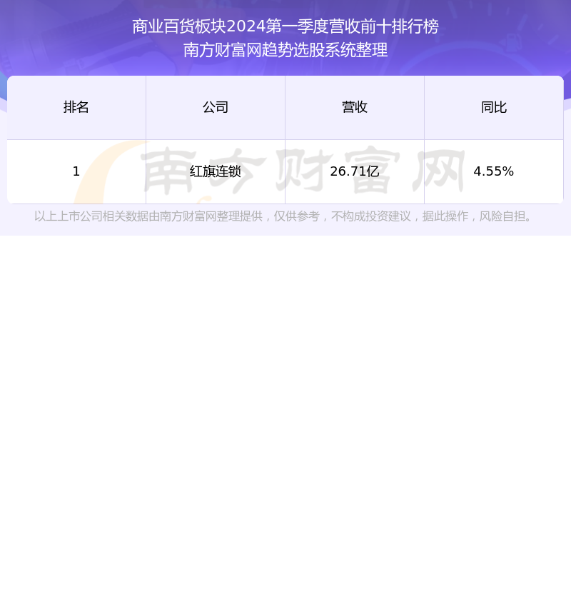 按照南方财富网趋势选股系统统计,该股所属板块为商业百货板块,该板块共有1只股票,南宁百货2024第一季度营收在该板块中排名为第1名,该板块2024第一季度营收排名前十的股票如下表:
