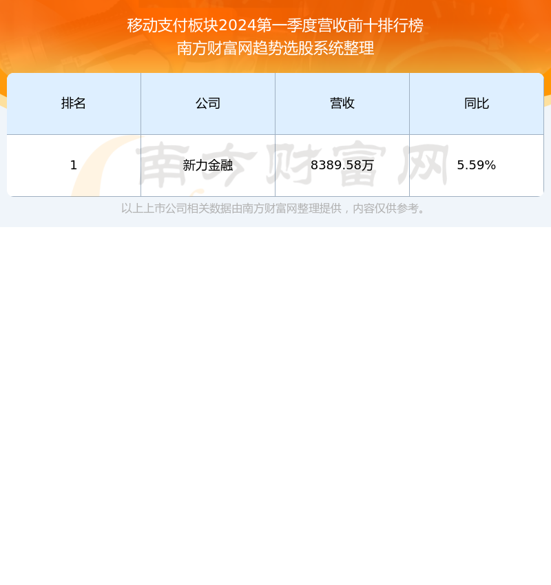 按照南方财富网趋势选股系统统计,该股所属板块为移动支付板块,该板块共有1只股票,信雅达2024第一季度营收在该板块中排名为第1名,该板块2024第一季度营收排名前十的股票如下表: