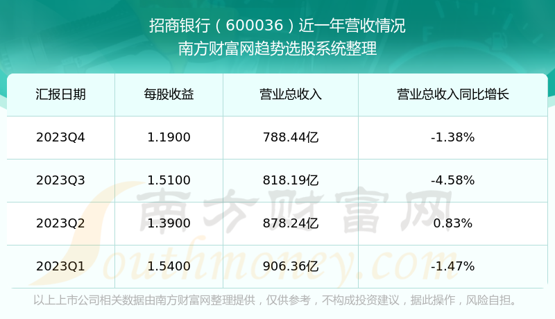 招商银行2023年第四季度公司实现营业收入788.44亿元,同比-1.38%;归母净利润327.12亿元,同比5.22%。